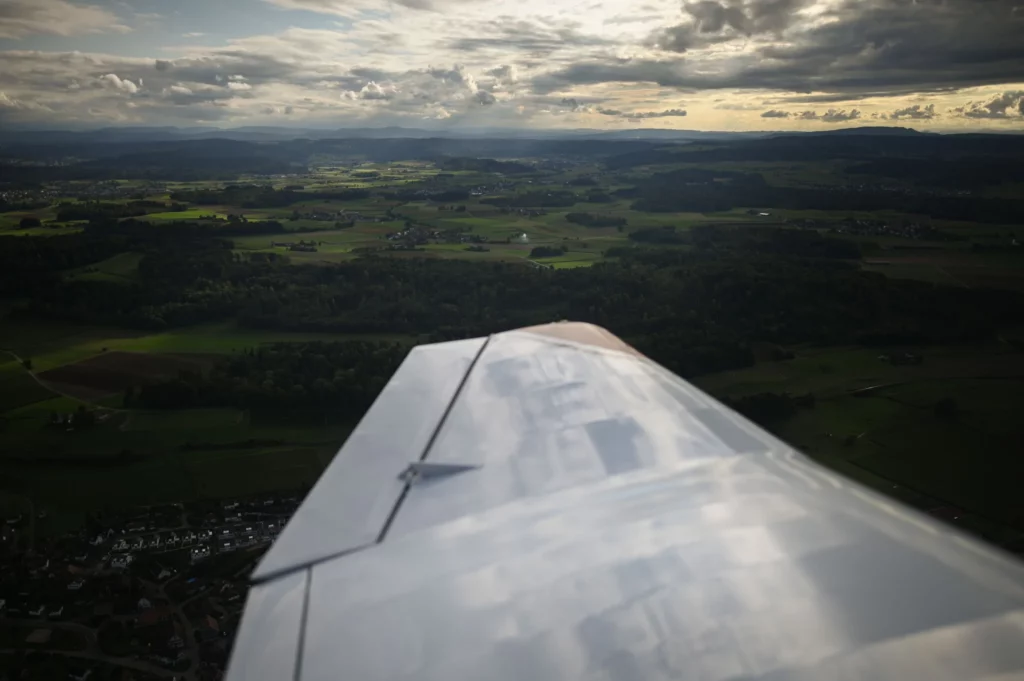 Mein Sitz ruckelt. Der Motor dröhnt. Der Propeller verwischt die Aussicht auf das Gras. Immer schneller fahren wir über die Piste. Und dann plötzlich: Wir fliegen. Die Räder der kleinen weiss-roten Maschine sind nicht mehr auf dem Boden. Die Thurgauer Landschaft erscheint immer kleiner. Ich atme ein und schaue nach unten. Fürchte ich mich?