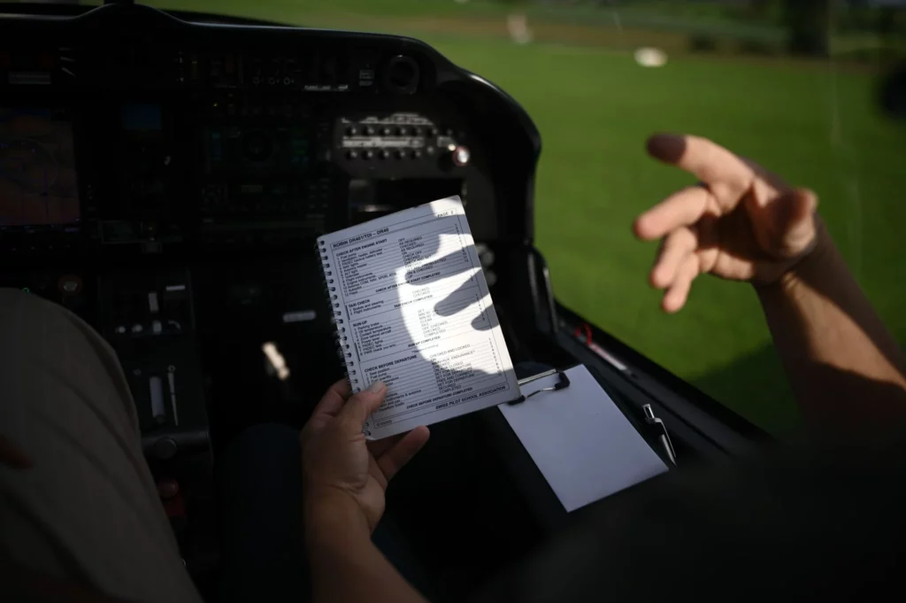 Briefing und Checks – Heinzelmann erklärt, was Pilotinnen und Pilotinnen alles erledigen müssen, bevor sie überhaupt ins Flugzeug steigen können. Für mich hat er das alles schon erledigt. Heinzelmann, unser Fotograf Benjamin Manser und ich fliegen zum Rheinfall.