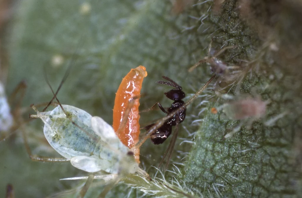 Tausende von Bildern wie dieses hat Keller in seiner Sammlung. Hier: Die schwarze Schlupfwespe legt ein Ei in die orange Gallmückenlarve, während diese an der weissen Grossen Brennnesselblattlaus saugt. (Bild: ETH Bildarchiv)