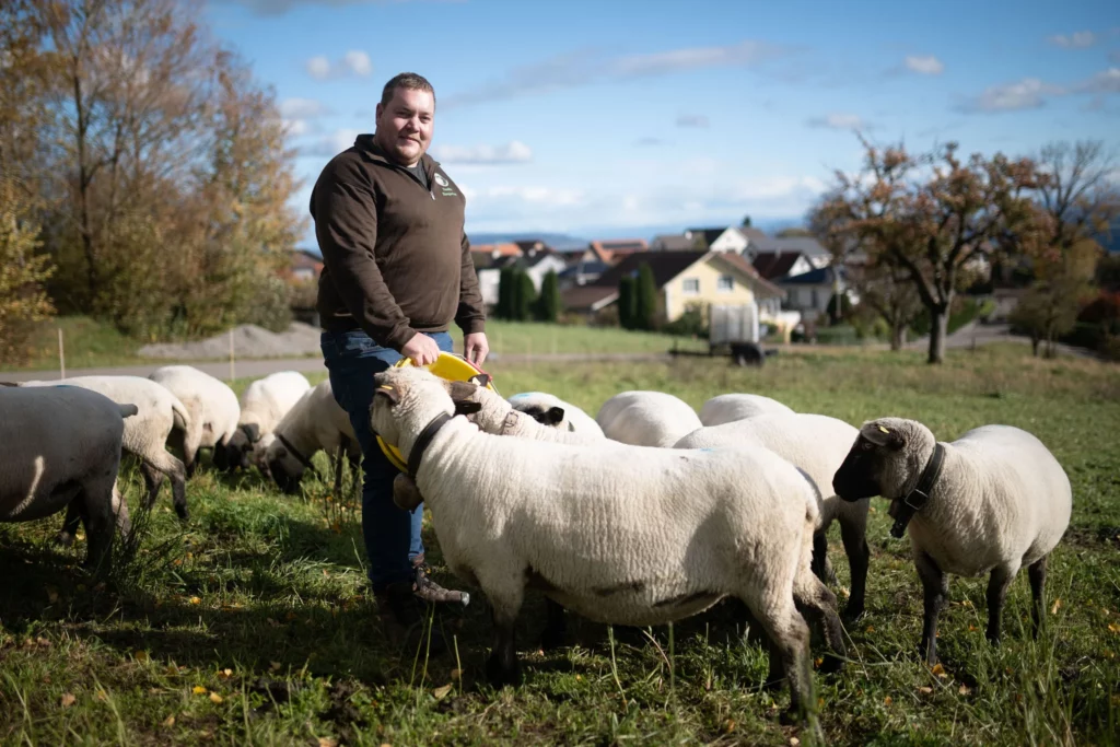 Kaum hat Pascal Hangartner den Eimer mit Futterpellets aus dem Kofferraum geholt, erklingen Glocken. Eine kleine Schafherde trottet über die Wiese. Aus allen Richtungen erscheinen die süssen Tiere mit schwarzen Nasen und Beinen.
