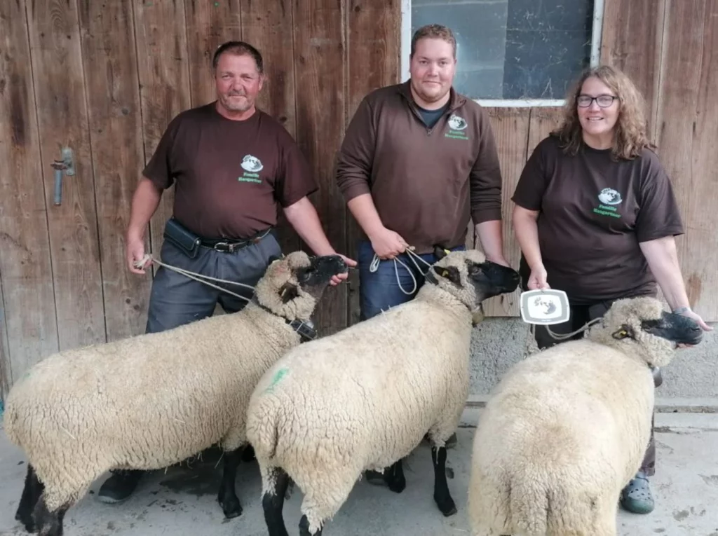 Peter, Pascal und Tanja Hangartner präsentieren die Siegerschafe der Rassenschau. (Bild: zvg)
